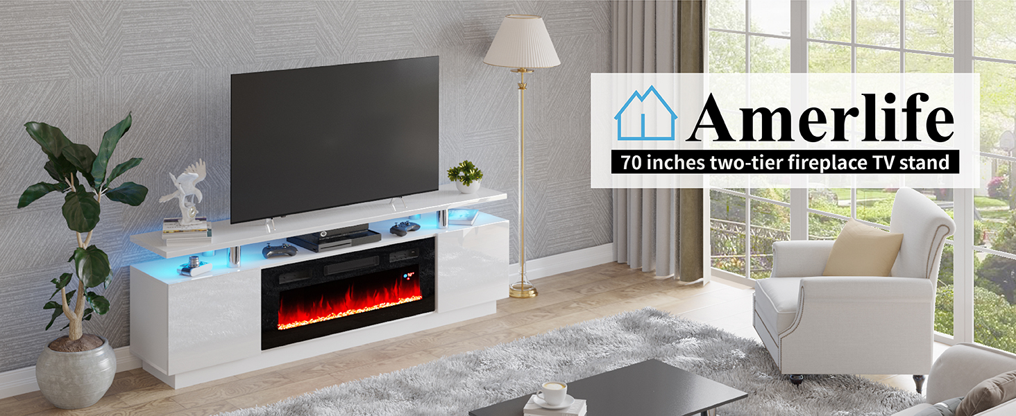 Brand AMERLIFE Power Source Corded Electric Product Dimensions 14.4"D x 70.2"W x 22.6"H Material Engineered Wood Finish Type High Gloss & Matte white Installation Type Freestanding Heat Output 5100 British Thermal Units Special Feature 70" Modern High Gloss. Adjustable Flame&LED. Temperature Control & Time Setting. 36" Electric Fireplace. 2 Tier Design Style Modern Color White & Black Room Type Living Room. Bedroom. Home Office Included Components Tv stand. Fireplace Item Weight 111 Pounds Model Name Large Storage Fireplace TV Stand Shape Rectangular Power Consumption 1500 Watts Chamber Depth 5 Inches Burner type Electric Item Weight 111 pounds ASIN B0BCY1DBWK Item model number FTS5351 Manufacturer AMERLIFE