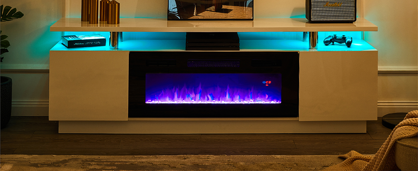 DetailBrand:AMERLIFEPower Source:Corded ElectricProduct Dimensions:14.4"D x 70.2"W x 22.6"HMaterial:Engineered WoodFinish Type:High Gloss & Matte whiteInstallation Type:FreestandingHeat Output:5100 British Thermal UnitsSpecial Feature:70" Modern High Gloss. Adjustable Flame&LED. Temperature Control & Time Setting. 36" Electric Fireplace. 2 Tier DesignStyle:ModernColor:White & Black