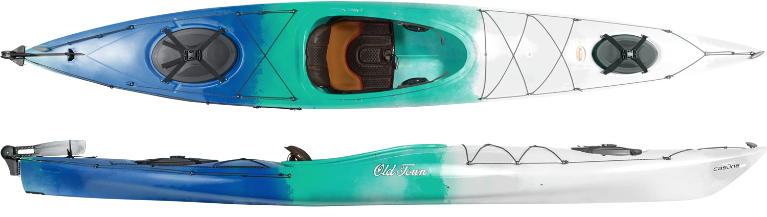 The Old Town Castine 145 is a light touring kayak that combines responsive handling with the stability and comfort of a recreational kayak. At 14' 5” long. it's perfect for day-trippers and weekend warriors seeking a relaxed. low-angle touring experience. It features a spacious cockpit and a low deck design. anchored by the adjustable and breathable ACS2 seating system. The innovative Slide-Away Day Hatch provides easy-to-access dry storage that stows neatly when not in use. Equipped with a foot-controlled rudder system. the Castine offers enhanced control in dynamic waters.