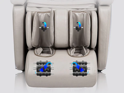 Located in the back portion of the calf massager are spinning rollers with 1 roller that provides a smooth kneading style massage. On the bottom of the foot massage rollers that spin along the arch of the feet which is complimented by airbag massage. As the airbags inflate the feet are pushed down on the spinning rollers increasing the intensity.