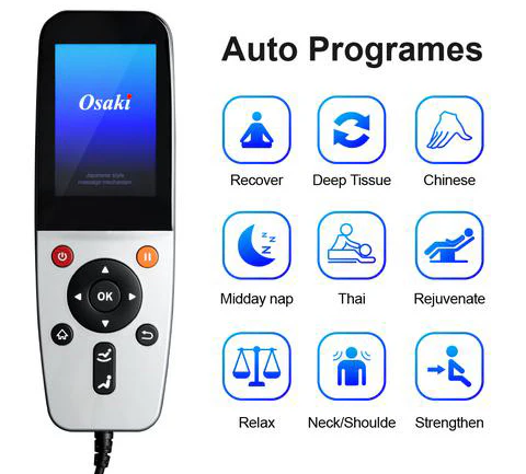 This Chair comes equipped with 9 different preset programs including: Recover. Deep Tissue. Chinese. Midday Nap. Thai. Rejuvenate. Relax. Neck/Shoulder. and Strengthen. These auto programs combine the 5 different massage techniques available in the chair. These 5 massage styles are: Kneading. Tapping. Shiatsu. Clapping. and Rolling.