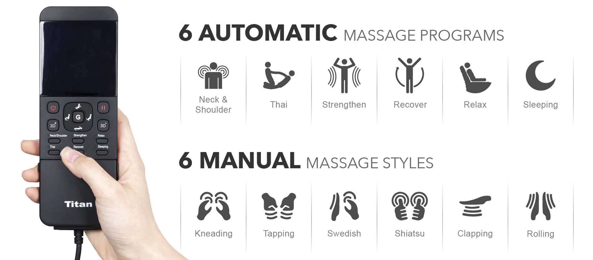 This Chair comes equipped with 6 different preset programs including: Neck & Shoulder. Thai. Strengthen. Recover. Relax and Sleeping. These auto programs combine the 6 different massage techniques available in the chair. These 6 massage styles are: Kneading. Tapping. Swedish. Rolling. Shiatsu and Clapping.