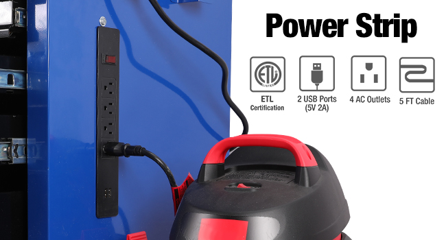- 【Practical Drawer & Power Strip】 The high-quality ball-bearing slide can smooth operation and full-extension without a slam and noise. Cushioned non-slip drawer liners protect tools from bashing into one another and prevent scratches on tool chest drawers. Locking system can keep your tools safe. The tool chest comes with ETL certification power outlet. The outlet 4 AC outlets and 2 USB-A ports will supply you with power whenever you need to plug in any of your work equipment.
